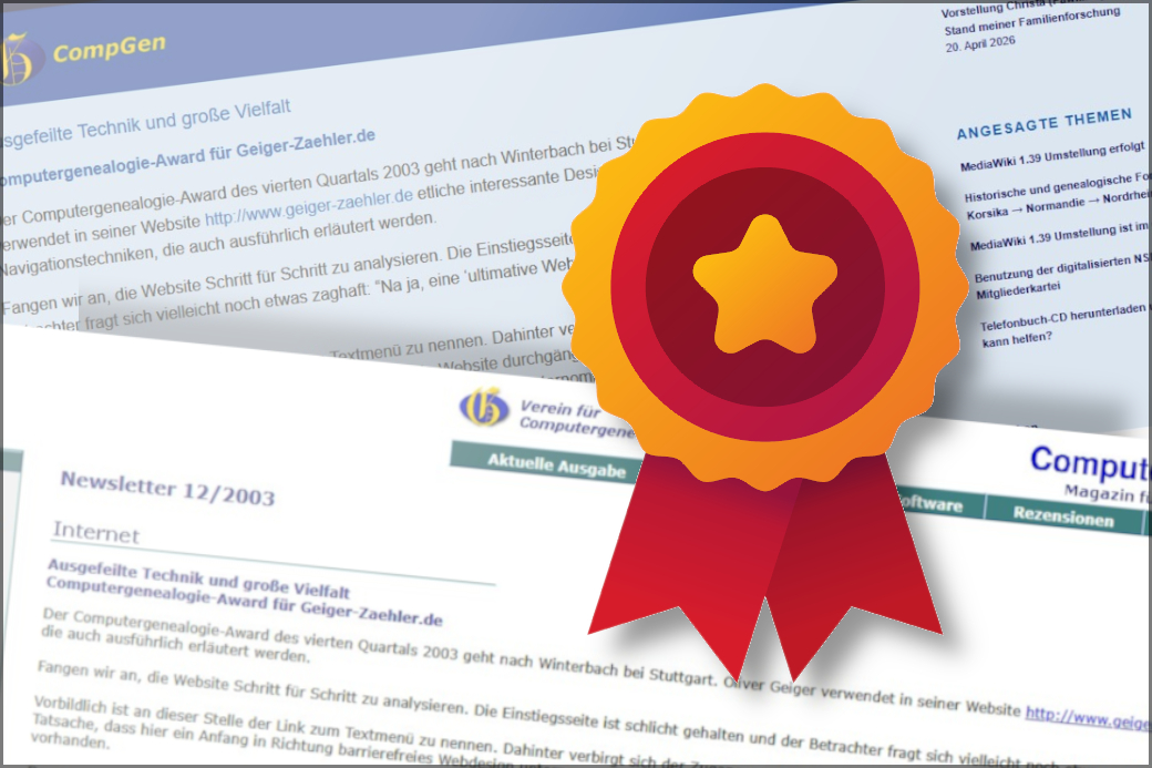 In der damaligen Ausgabe des Compgen-Newsletters vom Dezember 2003 hat meine Webseite den »Computergenealogie-Award« erhalten. Da dies eine der ersten Versionen meiner GEIGER.zähler-Webseite war – ich muss um das Jahr 2000 herum unter dieser URL mit der Publikation begonnen haben – ist vieles von dem, was damals dazu geschrieben wurde, mittlerweile so nicht mehr vorhanden. Aus statischen Webseiten mit JavaScript wurde eine dynamische Webseite mit entsprechendem Web-CMS. Viele Inhalte haben sich geändert und mittlerweile ist diese Webseite ausschließlich für das Thema »Genealogie« vorhanden.