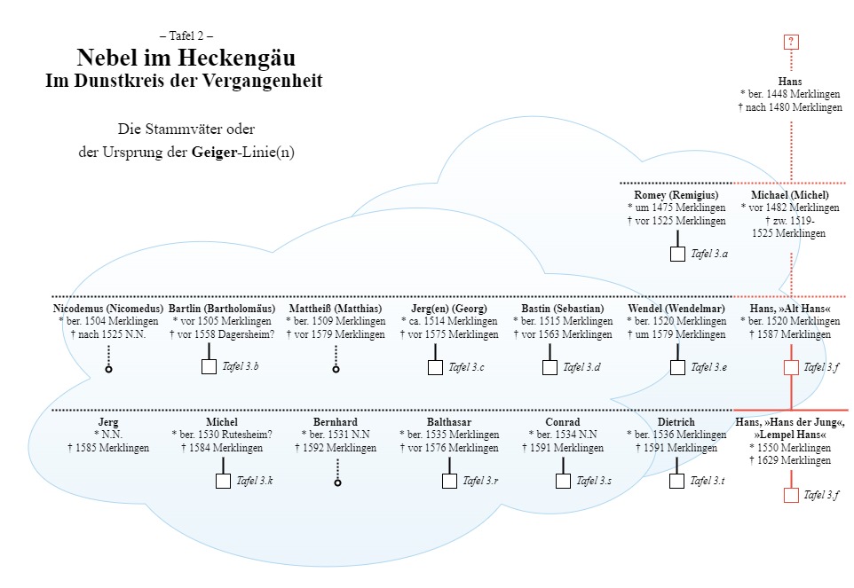 Für die eigentliche Forschung, sowie auch für die Darstellung in der Stammtafel, habe ich aus dem Dunstkreis der Personen den Hans Geiger (Gîger) auserkoren. Er ist auch gleichzeitig einer der ältesten belegbaren Vorfahren, und damit gebührt ihm eigentlich auch diese Ehre. Und solange wir keine andere Beweise oder Belege haben, kann ihn aktuell keiner von diesem Thron stoßen.