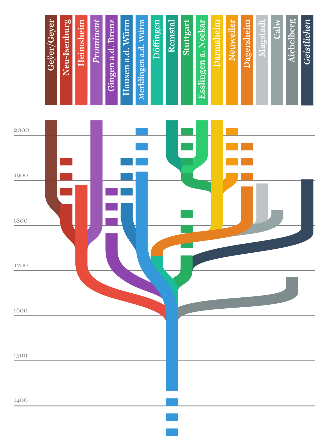 Somit spannte sich aus der bisherigen Stuttgarter-Linie der Bogen zur Geistlichen-Linie. Und da diese ziemlich oft im Auftrag der Kirche den Ausübungsort wechseln mussten, lassen sich diese auch nur schwer an einer bestimmten Lokalität oder Gegend zuordnen. Daher ergibt sich für diese eine neue Linie in meiner Familienforschung, die aber nur bis 1900 hier verweilt und dann wegen Mangel an männlichen Nachkommen leider endet.