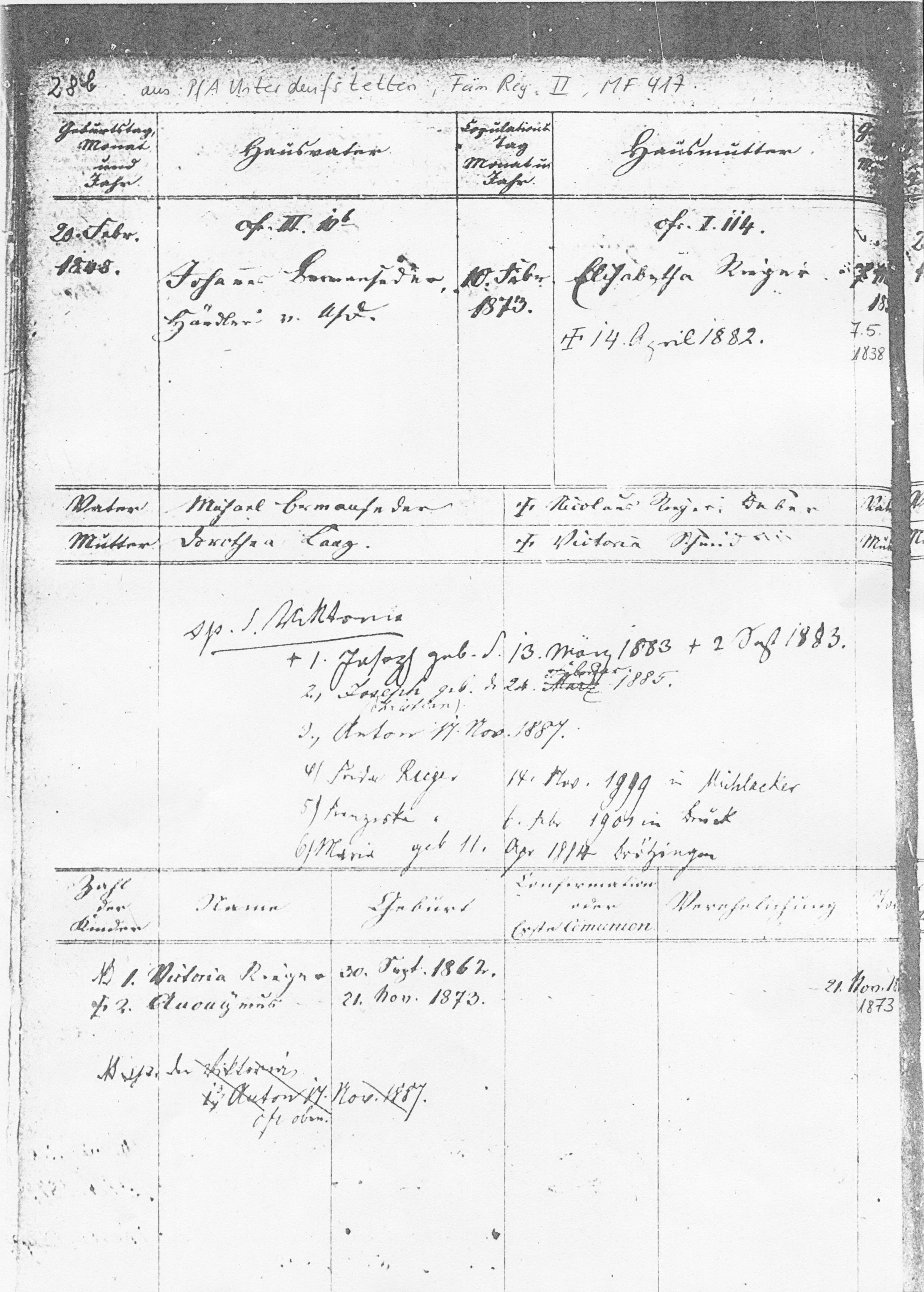- Nikolaus Rieger ( 1801 Hirlbach; 1863 Unterdeufstetten) Viktoria Schmid