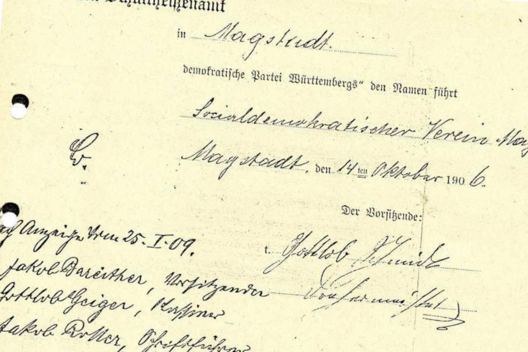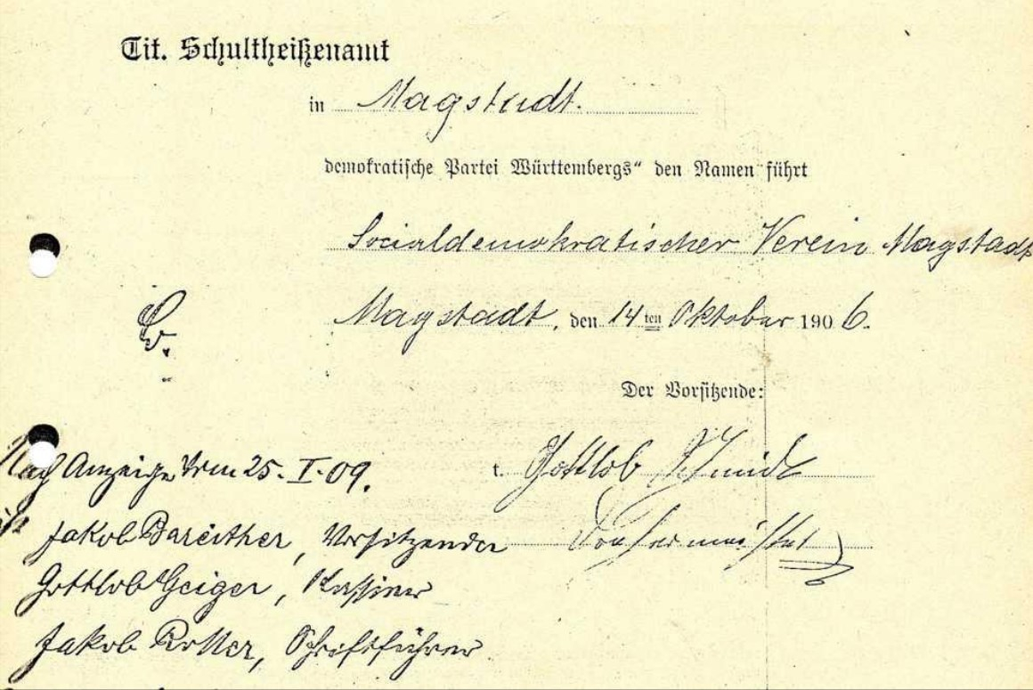 [1] Klaus Philippscheck, Bescheinigung für den »Sozialdemokratischen Verein Magstadt«, ausgestellt am 14. Oktober 1906; Webseite Gemeinde Magstadt; 20210; https://www.magstadt.de/fileadmin/Dateien/Dateien/900_Jahre/MagstadtKorsett__PPTminimizer_.pdf