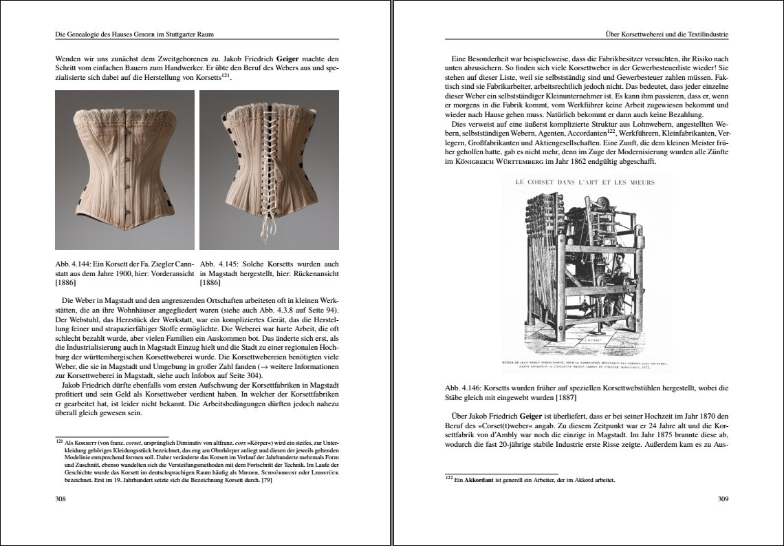 Ähnliches lässt sich auch bei meiner Familie finden. So gab es in unserer Familie viele Weber, auch schon vor dem Zuzug nach Magstadt. Da sich der Ort im Laufe der Zeit zu einem Hotspot für die Strumpfwirkerei und Korsettweberei entwickelt hat, finden sich hier viele der fast gleichen Situationen wie im Buch wieder. Als selbstständige Weber mussten meine Geiger ebenfalls verschiedene Abhängigkeiten zu ihren Auftraggebern hinnehmen, für die sie arbeiten mussten, und einer der Geiger war auch Mitglied oder Mitbegründer einer entsprechenden Gewerkschaft in Magstadt.