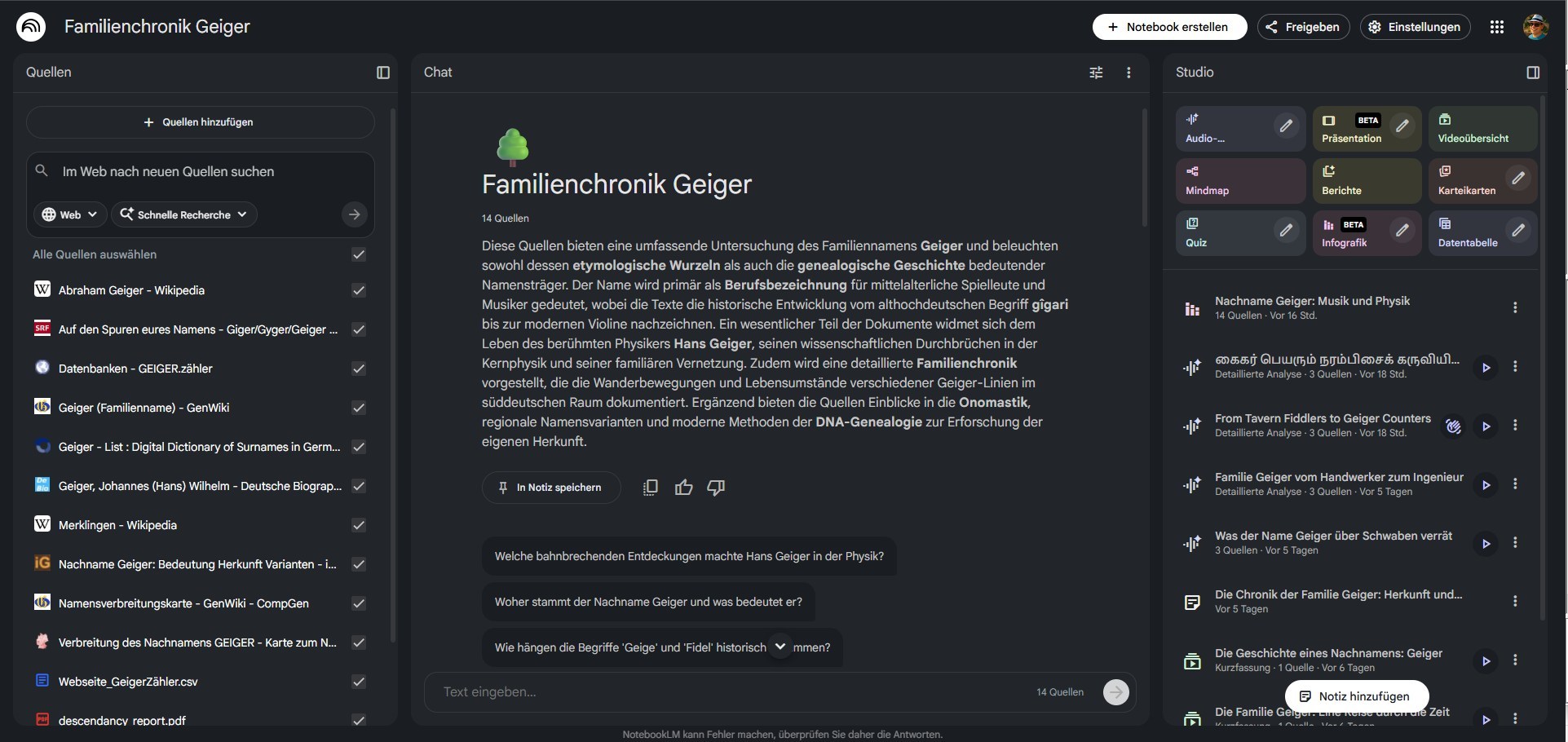 Über den Chatbot kann man dann auch jetzt einfache Fragen auf die Daten machen und bekommt auch zumeist eine entsprechend gute Rückmeldung von NotebookLM zurück. Mit weiteren Quellen kann ich die Inhalte noch anreichen und die Ergebnisse werden immer genauer und detailierter. In diesem Zuge habe ich weitere Webseiten angegeben, Reports aus meinen Genealogieprogramme hinzugefügt oder Datentabellen aus meiner Geiger-Forschung als CSV-Dateien hinzugefügt. Auch kann man über eine Web-Suche weitere ähnliche Quellen im Internet suchen und einfügen. Das erweitert das Spektrum der Daten und der Rückmeldungen ungemein und die Antworten der KI sind wirklich erschreckend gut.