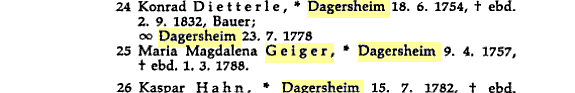Nachfolgend der Eintrag zur meiner Ahnin Maria Magdalena Geiger aus Dagersheim aus dem Deutsches Geschlechterbuch (Genealogishes Handbuch bürgerlicher Familien), Band 134.