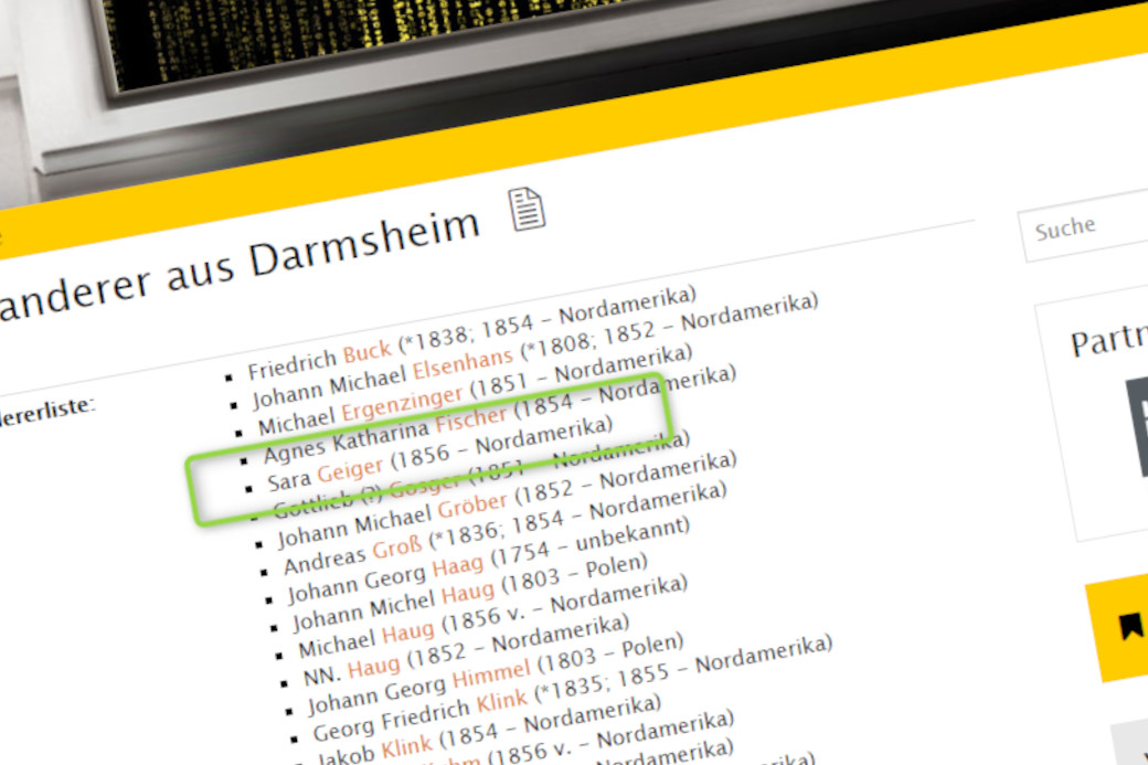 Über eine Quersuche bei Google habe ich meine Vorfahrin Sara Geiger, eine Auswanderin nach Nordamerika, im Landesarchiv Stuttgart in der Liste »Auswanderung aus Südwestdeutschland« wieder gefunden: