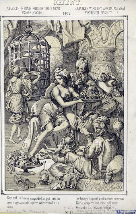 [2] Common Wikipedia, »Der in der Schlacht bei Ankara besiegte Bajazeth wird in einen eisernen Käfig gesperrt, seine gefangene Gemahlin als Sklavin behandelt«; https://de.wikipedia.org/wiki/Datei:Bajazeth_-_Timur_-_J_N_Geiger.jpg